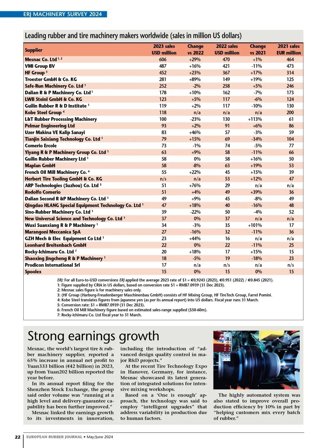 In the Latest May/June issue of European Rubber Journal, the sales revenue ranking of global rubber and tire machinery makers in 2023 was released, and MESNAC continued to defend the championship.